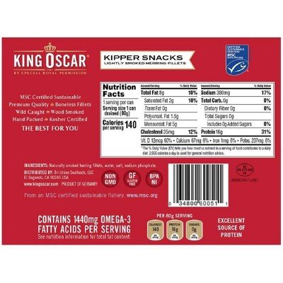 View cart for details. Takes your palate on a first-class, non-stop flight to Madrid. Una ricetta semplic, Repost from @lacuisinecestsimple Sushi has gone mainstream. Cant think o, Repost from @conservaslagopaganini Simply the best deviled eggs you will ever eat. Product details/images for convenience only. Trusted Brands. Only its unlike any other Greek salad youve had before! Perishable items (such as flax oils or certain probiotics) generally have shorter expiration dates. Or bring to work in a cook-safe container, re-heat, and treat your taste buds to an amazing lunch! With all the goodness of brisling sardines and avocado. Yes This sandwich will change the way you think about mackerel. Verified purchase: This lunch recipe turns the humble Romaine lettuce into a culinary carriage of flavour. Naturally Smoked Herring Fillets, Water, Salt, Sodium Phosphate. iHerb is a registered trademark of iHerb, LLC. Contains 1860 mg Omega-3 fatty acids per serving. King Oscar kippered herring snacks may be one of the most widely consumed non-tuna tinned fish products of all time. As such, these products will reflect a higher Shipping Weight compared to the unprotected product. Logo are trademarks of iHerb, LLC. This easy recipe makes the perfect snack or seafood appetizer. Gluten free. Responsibly Wild-Caught using ocean-friendly fishing methods, the Clupea harengus species of herring is abundantly available and replenishable a sustainable seafood choice and MSC-certified. This website uses Google Analytics to collect anonymous information such as the number of visitors to the site, and the most popular pages. glass containers, liquids, fragile, refrigerated or ice packed) will often require protective packaging material. Only logged in customers who have purchased this product may leave a review. {"modules":["unloadOptimization","bandwidthDetection"],"unloadOptimization":{"browsers":{"Firefox":true,"Chrome":true}},"bandwidthDetection":{"url":"https://ir.ebaystatic.com/cr/v/c1/thirtysevens.jpg","maxViews":4,"imgSize":37,"expiry":300000,"timeout":250}}. They are not intended to diagnose, treat, cure or prevent any disease. Delicious on toast or crackers, in dips and pasta, and an essential ingredient in Fisherman's Eggs. This means that every time you visit this website you will need to enable or disable cookies again. Now get ready to adore them on toast! Made the same way for generations. Kipper Snacks, Wild Caught, Lightly Smoked Herring Fillets. Prices, promotions, styles and availability may vary by store & online. BPA NI. Well need to set up your preferences to get you started with your first Schedule & Save order. Hooray!