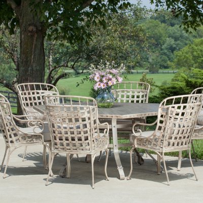 The best-rated product in Outdoor Lounge Furniture is the Vaughn 7-Piece Wood Patio Conversation Set with Sunbrella Spa Blue Cushions. Dimensions: Stationary Dining Chair: 28.3 x 24.6 x 36. Renditions 7-Piece Aluminum Outdoor Dining Set with